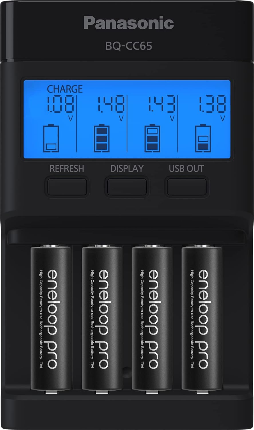 Carregador Rápido Super Avançado Panasonic K-KJ65KHA4BA com 4 Posições, Painel Indicador LCD, Porta de Carregamento USB e 4 Pilhas Recarregáveis eneloop pro AA, Preto