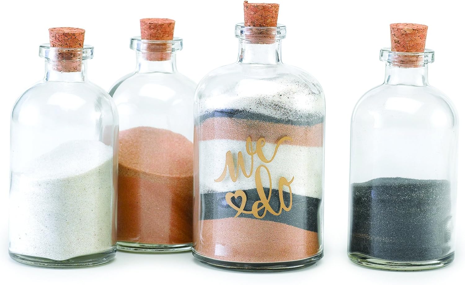 O Conjunto de Cerimônia de Areia Hortense B. Hewitt é o complemento perfeito para qualquer casamento. Este conjunto de 4 peças inclui um cilindro grande decorado e três cilindros pequenos em vidro, feitos nos EUA. O cilindro grande possui a frase We Do impressa em dourado metálico, criando um toque elegante para a cerimônia. Recomendamos o uso de pelo menos um pacote de areia para os cilindros pequenos, podendo utilizar até 3.5 pacotes no cilindro grande (a areia não está incluída, mas está disponível em uma ampla variedade de cores). Al