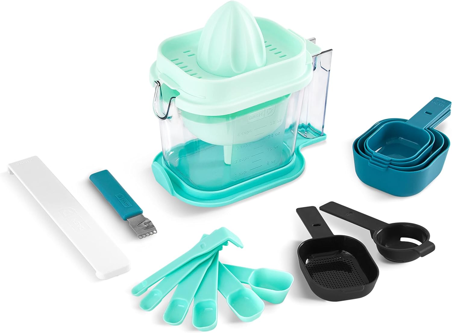 Conjunto de medição Dash SmartStore™ com espremedor de citrinos, 6 colheres de medição, 4 xícaras de medição, copo de medição líquida, zester de citrinos, funil, nivelador