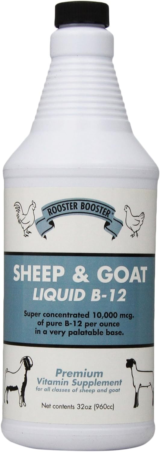 Rooster Booster Sheep & Goat Liquid B-12 é um suplemento super concentrado com 10.000 mcg de B-12 puro por onça. Essencial para a produção de glóbulos vermelhos, função do sistema nervoso, produção de esperma, crescimento normal e função adequada do sistema imunológico. Além disso, o B-12 aumenta o apetite e o ganho de peso, e proporciona mais energia para os animais. Fabricado nos Estados Unidos, este suplemento é altamente recomendado para ajudar na criação de campeões no ringue de competições. Com 4.8 de 5 estrelas de avaliação, é um dos princip