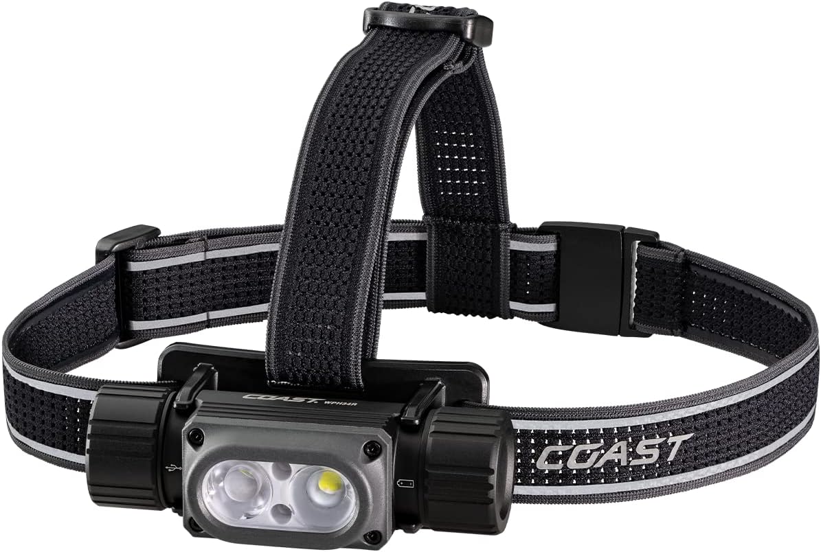 Lanterna de cabeça poderosa à prova d'água Coast WPH34R 2000 Lumen IP68 recarregável por USB - Dupla potência, 6 modos com feixe de luz spot e flood, preto/cinza
