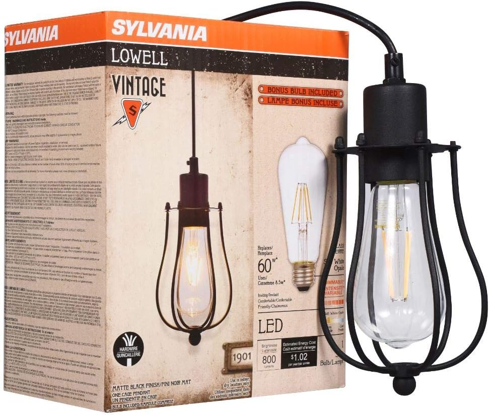 Luminária de Pendente LED Vintage SYLVANIA Lowell com Lâmpada de Filamento Dimmable Clear 60W = 8,5W ST19 Edison, Acabamento Preto, Cabo e Plugue de 15' (60142)
