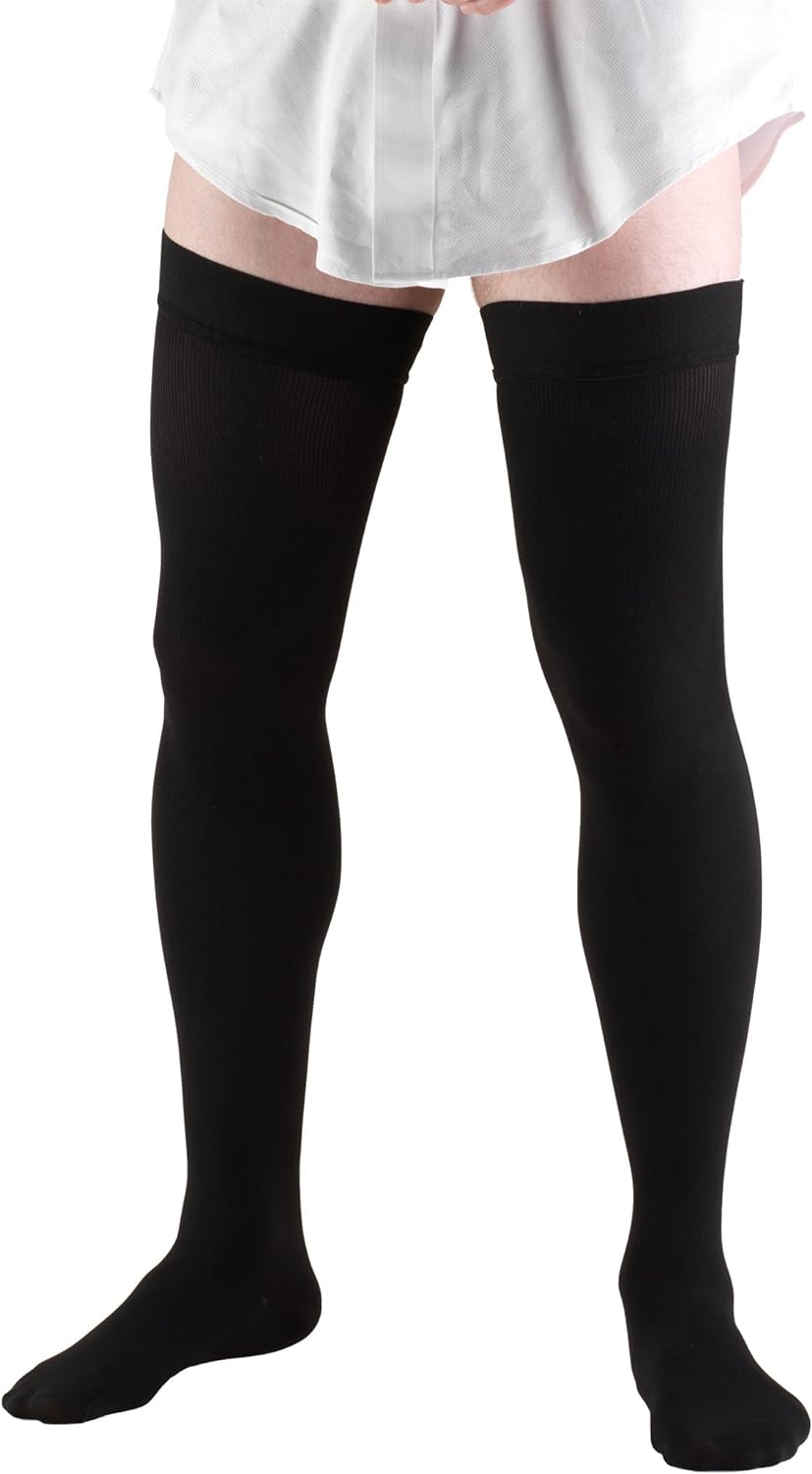 Compre as Meias de Compressão Truform 1945 para Homens de Até-coxa para Alívio de Veias Varicosas e Pernas Cansadas. Feitas nos EUA, essas meias oferecem suporte firme com compressão graduada de 20-30 mmHg, o que ajuda a melhorar a circulação e aliviar inchaço, dores e cansaço nas pernas. Além disso, elas são ideais para recuperação muscular, pós-cirurgia e para evitar coágulos sanguíneos. As meias possuem um topo com tecnologia de silicone grip que mantém as meias no lugar e um bolso definido