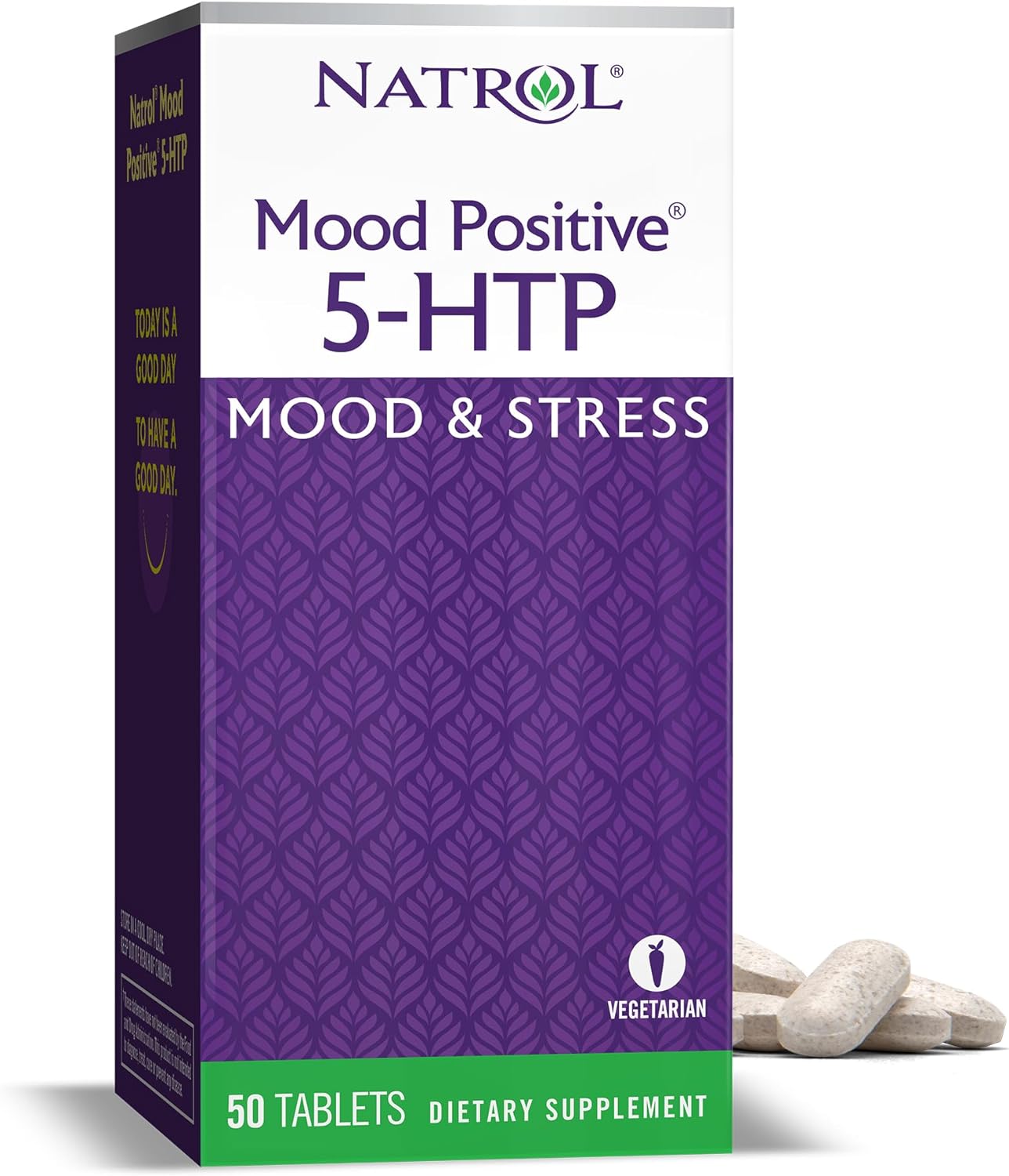 Natrol Humor Positivo 5-HTP 50mg com L-Teanina, Vitamina B6, Vitamina B12 e Ácido Fólico, Suplemento Dietético que Ajuda a Apoiar um Humor Positivo, 50 Comprimidos