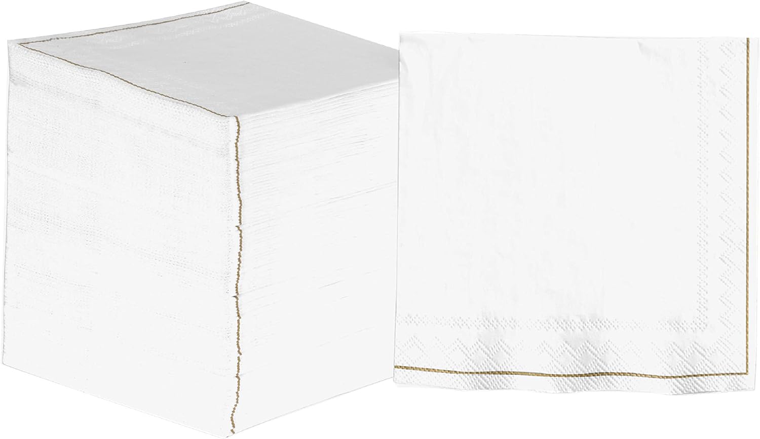 Pacote de 120 Guardanapos Quadrados de Almoço Luxuosos, Descartáveis, Papel Premium de 3 Camadas, 6,5 x 6,5 Polegadas, Guardanapo Decorativo, Branco com Listras Douradas.