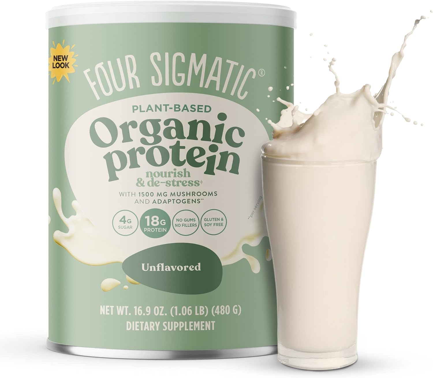 Pó de proteína orgânica à base de plantas Four Sigmatic sem sabor com Lion's Mane, Chaga, Cordyceps e mais | Proteína vegana limpa elevada para função cerebral e suporte imunológico | 16,9 oz