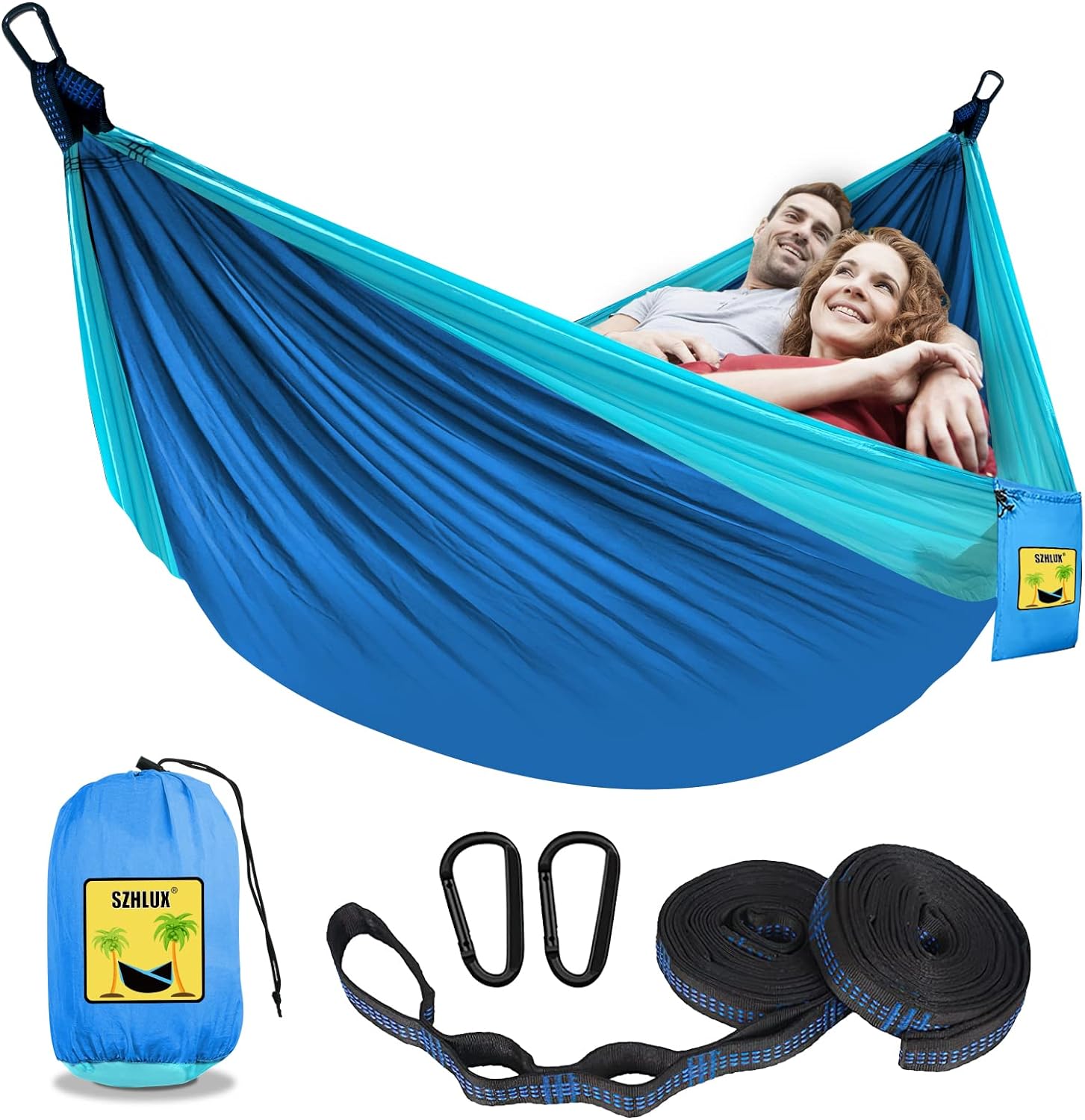 Rede de Acampamento Dupla Portátil SZHLUX com Acessórios e Equipamentos de Acampamento, Ótimo para Caminhadas, ao Ar Livre, Praia, Acampamentos, Azul Escuro e Azul Céu, Grande