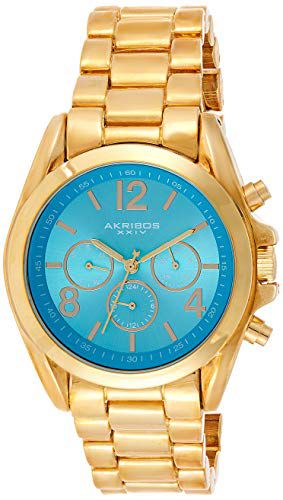 O Akribos XXIV Women's Multifunction Swiss Watch - AK760YGTQ é um relógio feminino elegante e sofisticado que combina estilo com funcionalidade. Com sua caixa em aço inoxidável e pulseira em aço inoxidável, este relógio possui um mostrador com efeito de sol e três submostradores que exibem o dia da semana, data e o horário em uma segunda localidade (GMT). A cor turquesa traz um toque de elegância e modernidade à peça.