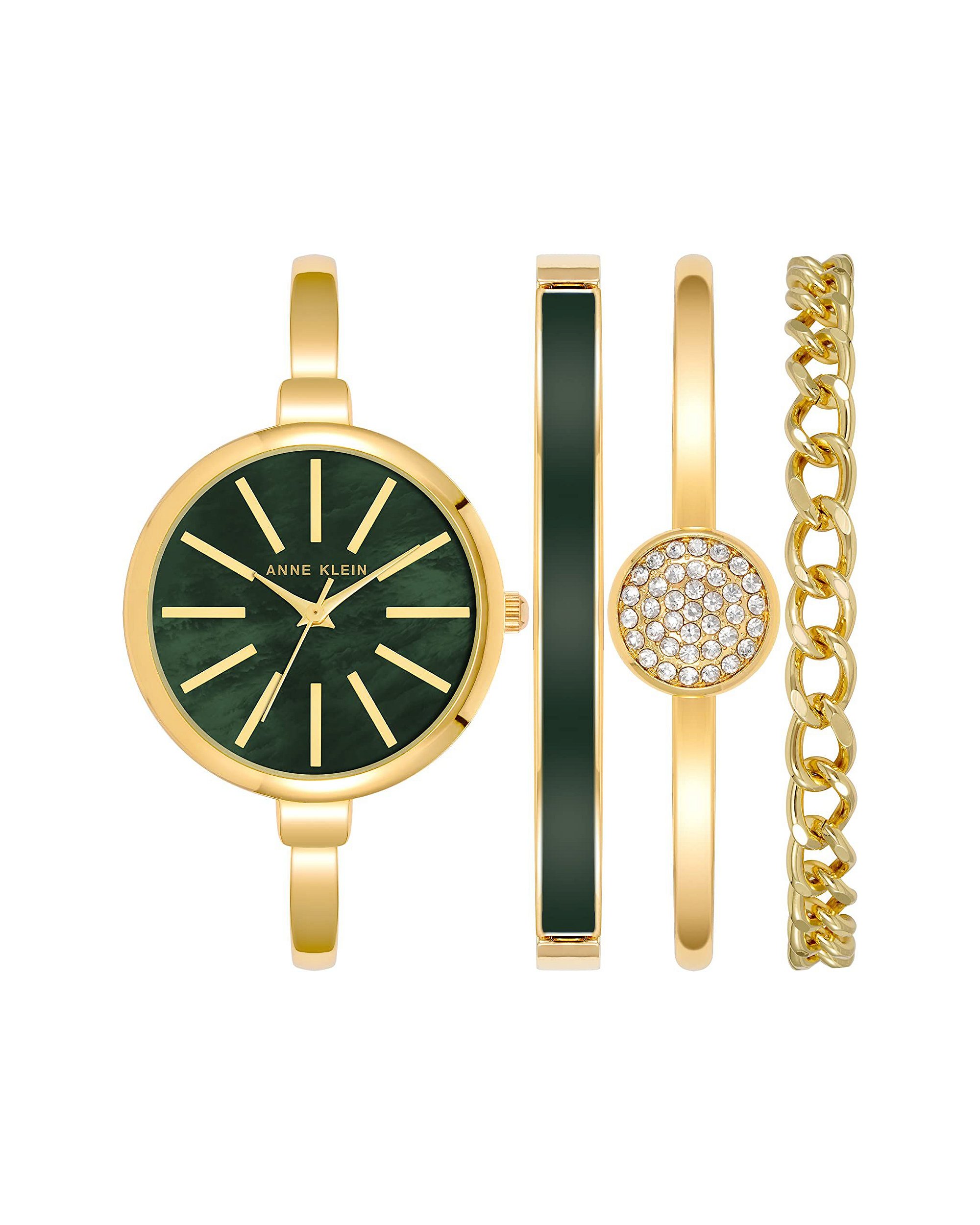 Procurando por um relógio e pulseira que são elegantes e modernos? O conjunto de relógio e pulseira Anne Klein Women's Bangle AK/1470GNST é a escolha perfeita. Com um design sofisticado e uma combinação de cores em dourado e verde, este conjunto é ideal para qualquer mulher que deseja adicionar um toque de estilo ao seu visual.