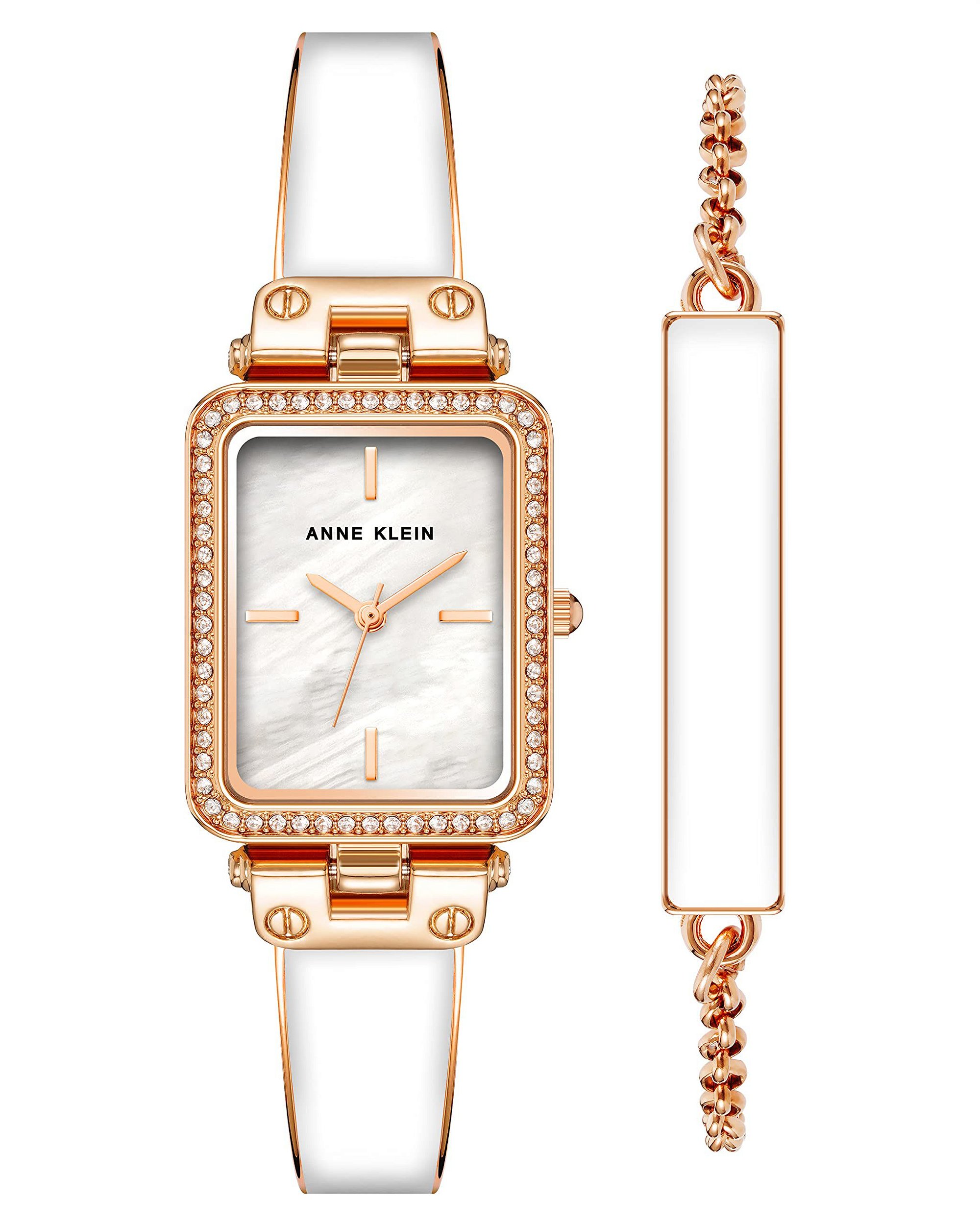 Procurando por aquele toque de elegância e sofisticação para o seu visual? O Anne Klein Women's Premium Crystal Accented Bangle Watch and Bracelet Set é a escolha perfeita para você. Este conjunto deslumbrante apresenta um relógio de pulseira e pulseira a condizer, proporcionando um estilo completo em um único pacote.