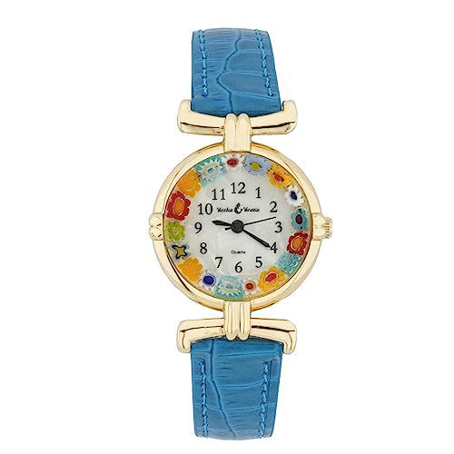 Glass Of Venice Murano Glass Millefiori Watch Round Multicolor Gold-Tone - 1 Face with Light Blue Band for Women é um relógio feminino de alta qualidade, feito à mão na Itália pela renomada marca Glass Of Venice. Este relógio apresenta detalhes de vidro Murano Millefiori, resultando em um design elegante e único que certamente chamará a atenção.