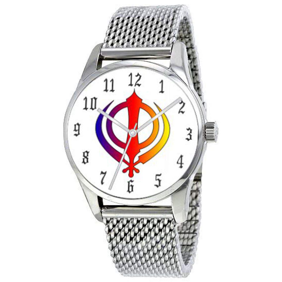 Procurando por um relógio que combine estilo e inspiração? Conheça o Inspirational Time Sikh Khanda Watch with Large Polished Chrome Case and Adjustable Stainless Steel Mesh Band. Este belo relógio apresenta uma pulseira de malha de aço inoxidável ajustável que proporciona conforto e estilo. O grande mostrador cromado polido adiciona um toque de elegância, enquanto o destaque do símbolo Sikh Khanda em vermelho traz uma mensagem inspiradora.
