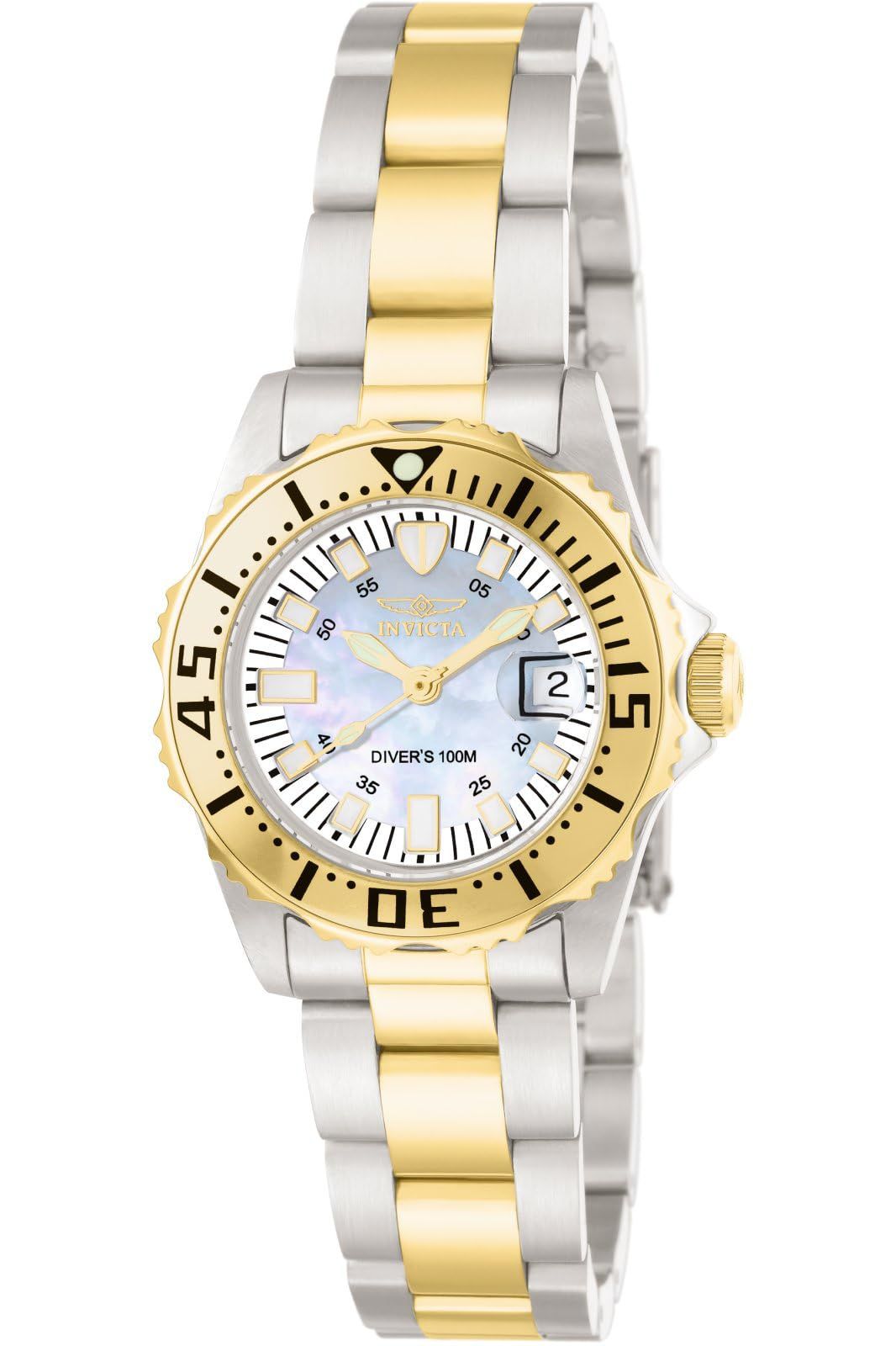 Palavras-chave: Invicta Women's 6895, Pro-Diver, relógio de aço inoxidável, banho de ouro 18k, madre pérola, resistente à água, movimento de quartzo suíço, NMS Comércio.