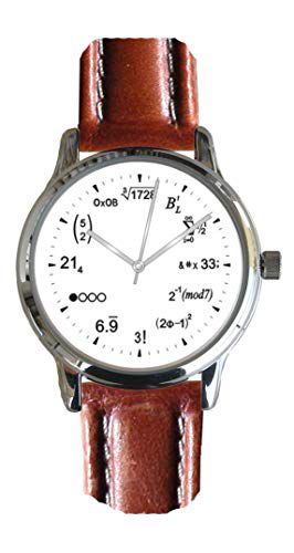 O Math Dial Watch Shows Physics Equations at Each Hour é um relógio grande e polido cromado com uma pulseira de couro marrom avermelhado. Este relógio exclusivo exibe equações de física em vez dos números tradicionais em seu mostrador, oferecendo um visual sofisticado e intelectual.