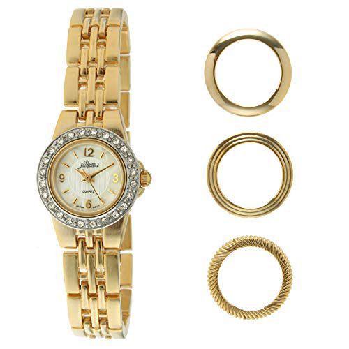 Se você está procurando por um relógio feminino elegante e versátil, o Pierre Jacquard Women's Gold-Tone Crystal Petite Watch with 4 Interchangeable Bezels Gift Set é a escolha perfeita para você. Este conjunto de presente luxuoso oferece não apenas um relógio bonito, mas também quatro aros intercambiáveis que podem ser trocados facilmente para combinar com qualquer visual.