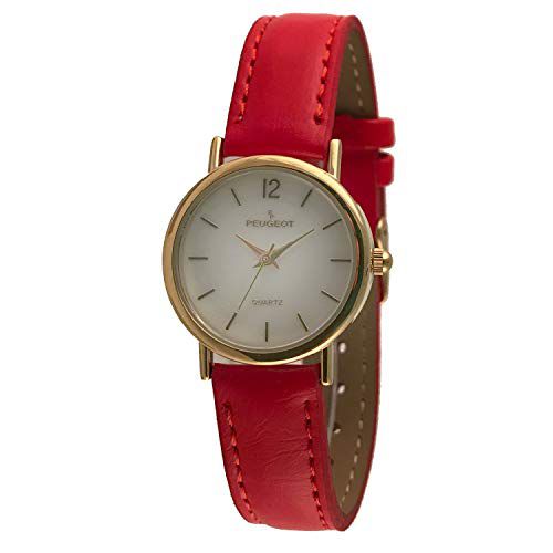 O Peugeot Women Classic Everyday Watch possui um design clássico com um toque moderno, com sua caixa redonda banhada a ouro 14K e uma pulseira de couro vermelho que adiciona um toque de cor ao seu look. Além disso, este relógio é resistente à água, garantindo durabilidade e praticidade para o seu dia a dia.