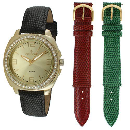 O Peugeot Women Boyfriend Size Watch com Crystal Bezel e 3pc Interchangeable Leather Band Gift Set é uma escolha excelente para quem busca um relógio elegante e atemporal, com a qualidade e estilo que são marcas registradas da Peugeot.