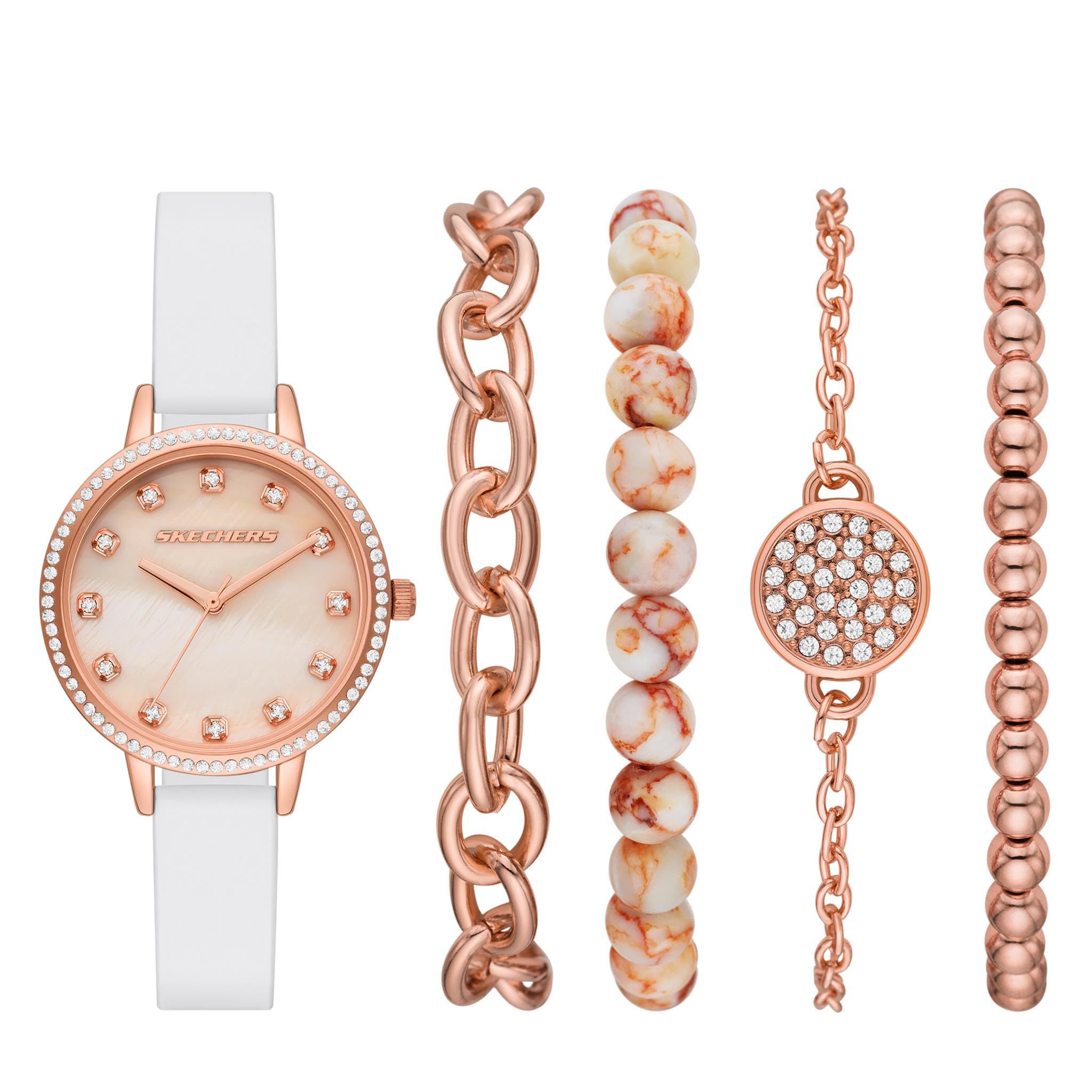 Procurando por um relógio elegante e moderno para presentear alguém especial ou para si mesma? Então o set de presente Skechers Women's Quartz Three-Hand Watch & Bracelet é perfeito para você! O modelo SR9080 possui um design deslumbrante na combinação de cores rose gold e white, que confere um toque sofisticado e feminino ao conjunto. Além do relógio de quartzo com ponteiros de três mãos, o set também inclui uma pulseira que complementa o visual com elegância.