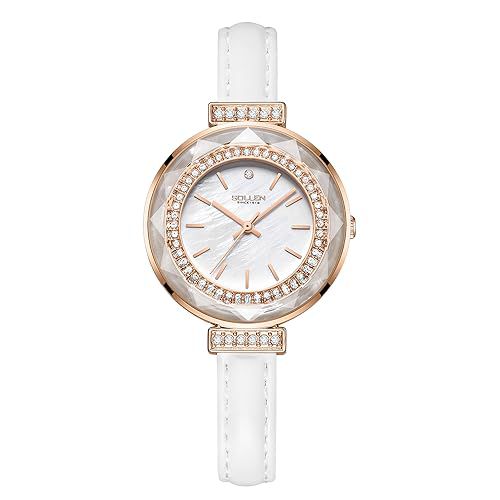 Palavras-Chave: SOLLEN Women Quartz Watch, White Ladies Watches, Leather Strap, Diamond Design, Shell Dial, White-1.