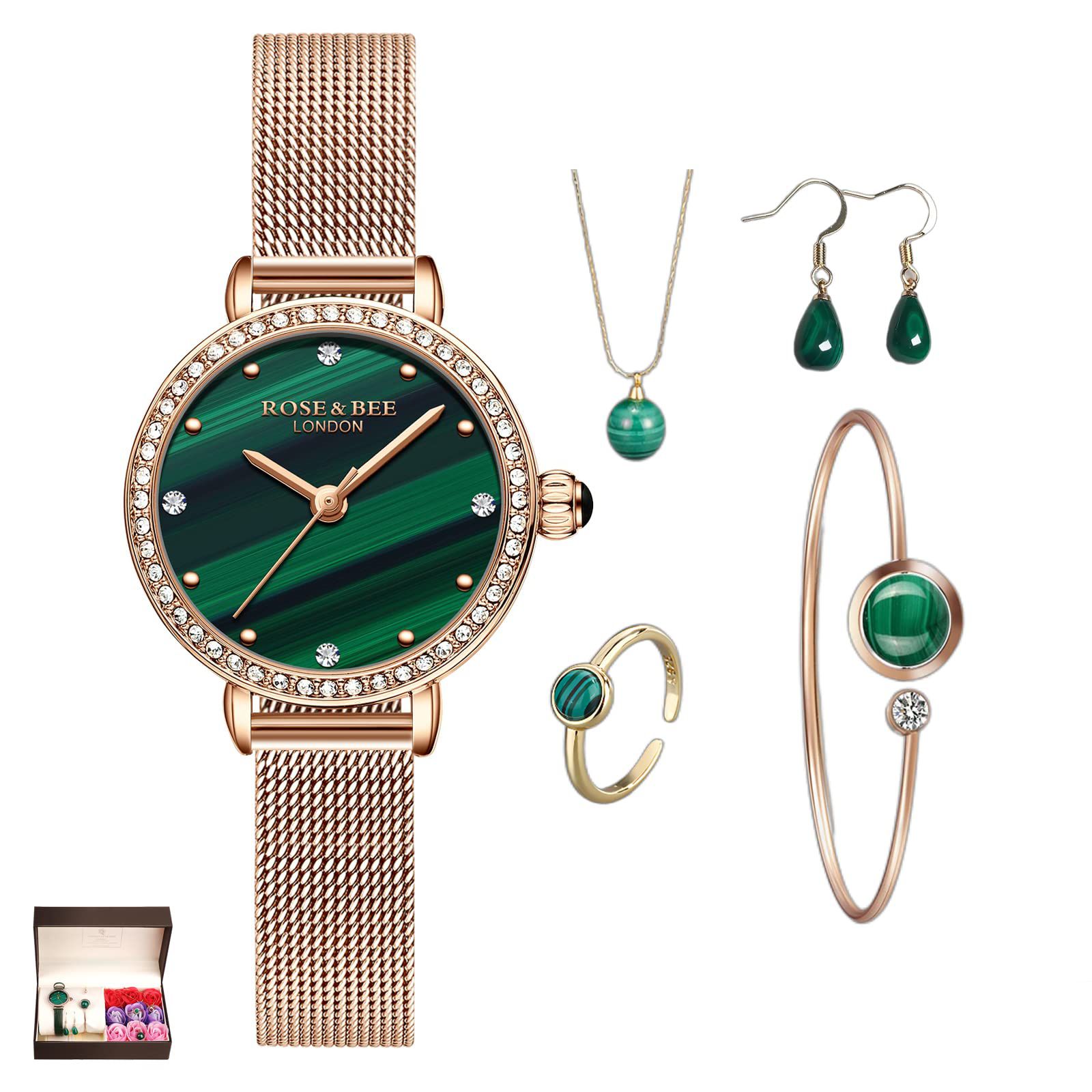 Procurando por um relógio feminino elegante, sofisticado e com um toque retrô? Apresentamos o TENNOVO Rose&Bee Retro Malachite Women's Watch Set! Este conjunto elegante e deslumbrante vem em uma caixa de presente, perfeito para presentear em aniversários, Dia dos Namorados ou aniversários.