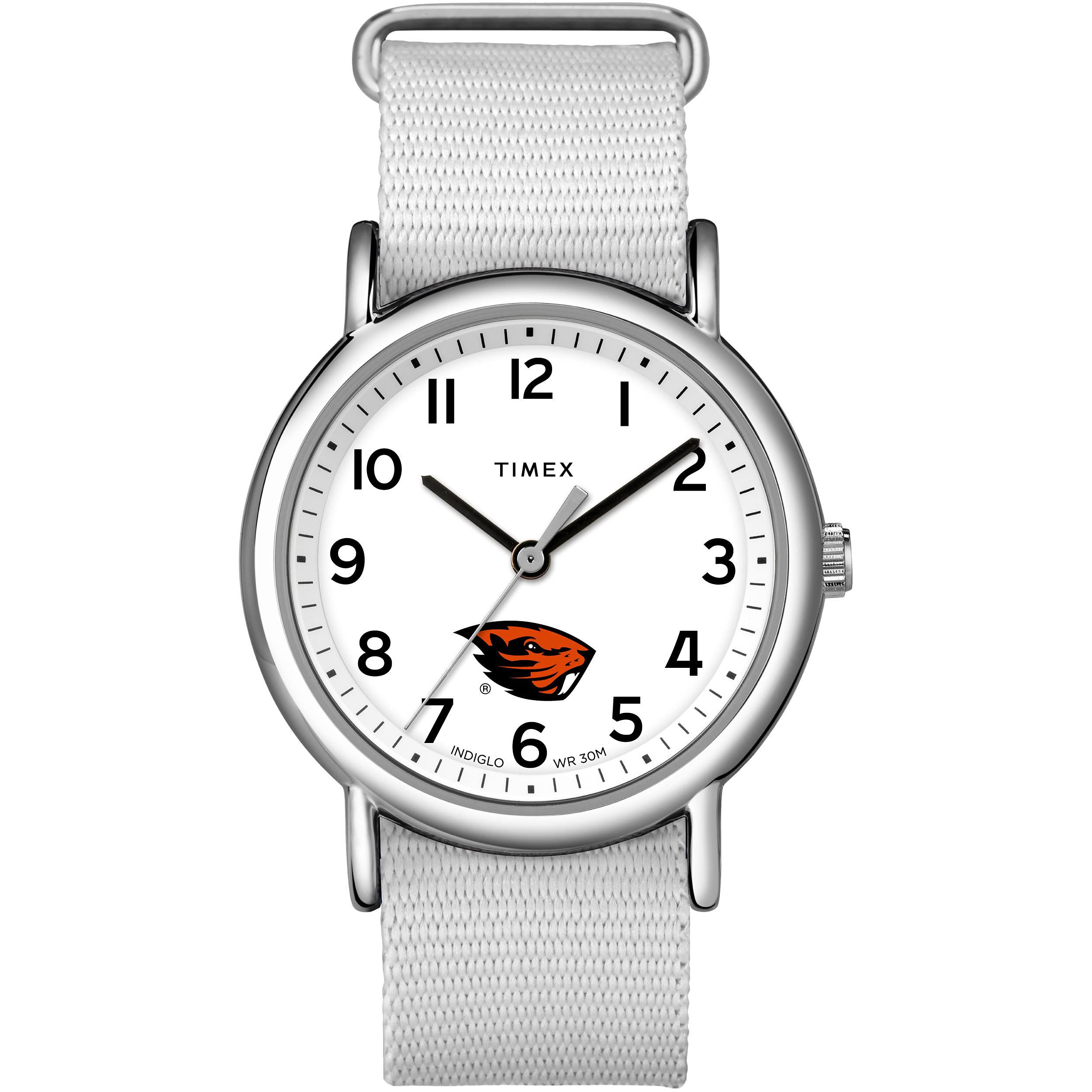 O mostrador branco contrasta lindamente com o logotipo dos Beavers em cores vibrantes, criando um visual marcante e moderno. A pulseira de tecido branca slip-thru oferece conforto durante todo o dia, além de adicionar um toque esportivo ao visual.