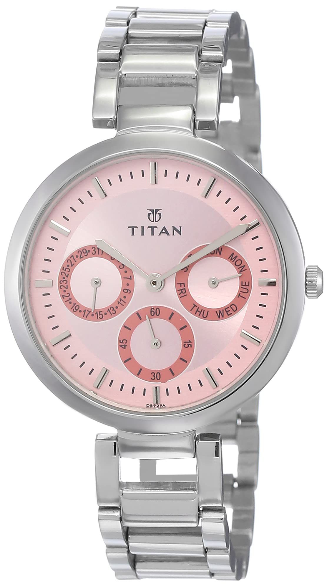 Procurando por um relógio feminino contemporâneo e funcional? Apresentamos o Titan Women's Contemporary Chronograph, Multi Function, Work Wear, Gold, Silver Metal, Leather Strap, Mineral Crystal, Quartz, Analog, Water Resistant Wrist Watch Titan NR2480SM05, disponível na cor Pink/Silver. Este relógio é perfeito para mulheres modernas que valorizam estilo e praticidade.