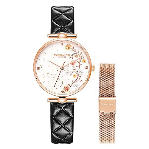 Se você procura por um relógio de quartzo elegante e sofisticado, o VICTORIA HYDE VH1040F é a escolha perfeita para mulheres que valorizam o estilo e a qualidade. Este relógio apresenta um mostrador floral em preto-rose gold, combinando perfeitamente com sua pulseira de couro genuíno e sua pulseira de malha em aço inoxidável. Além disso, a cor Black-Rosegold adiciona um toque moderno e elegante ao seu visual.