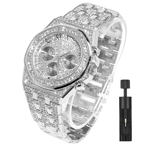 O Apzzic Gold Plated Iced Out Watch Diamond CZ tem um mostrador de 40mm de largura, com numerais romanos que conferem uma aparência clássica e atemporal. Além disso, o seu movimento de quartzo garante precisão e confiabilidade.