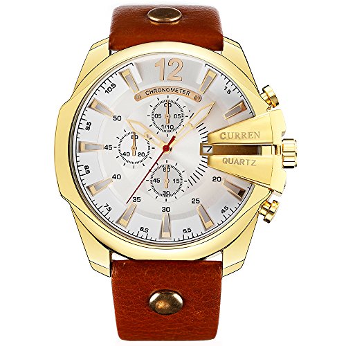 Este relógio de pulso possui uma pulseira de couro que proporciona conforto e durabilidade, ideal para quem está sempre em movimento. Além disso, o mostrador grande em dourado com detalhes em branco dá um toque de sofisticação ao acessório, garantindo que ele se destaque no pulso de quem o usa.