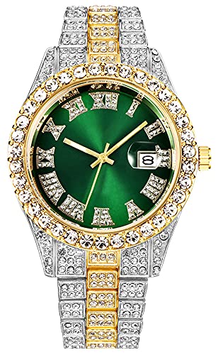 Procurando por um relógio masculino estiloso e cheio de personalidade? O LGXIGE Mens Big Rocks with Roman Numerals Fully Ice Out Colorful Dial Gold Watch (Silver Gold Green) LGXIGE V1278 é a peça perfeita para você. Com um design marcante e diferenciado, este relógio é a combinação perfeita entre elegância e ousadia.