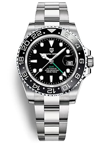 O Men Watch Pagani Design GMT Watches for Men Automatic 40MM Date 100M Waterproof Stainless Steel Sapphire Glass Mechanical Wristwatches PD-1662(3 Black) PAGRNE DESIGN pagani watch possui também um mecanismo automático, garantindo uma experiência livre de preocupações com a troca de bateria. Seu design inclui a funcionalidade de data e um mostrador de 40mm, ideal para quem busca um relógio de tamanho médio. Seu visual preto combina com qualquer estilo, tornando-o um acessório versátil e atemporal.
