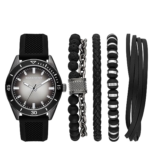 Procurando por um presente de alta qualidade para um homem especial em sua vida? O Conjunto de Presente Watch & Bracelet da Skechers é a escolha perfeita! Este conjunto impressionante apresenta um relógio Quartz Three-Hand e uma pulseira de silicone preta combinando, oferecendo um visual moderno e elegante.