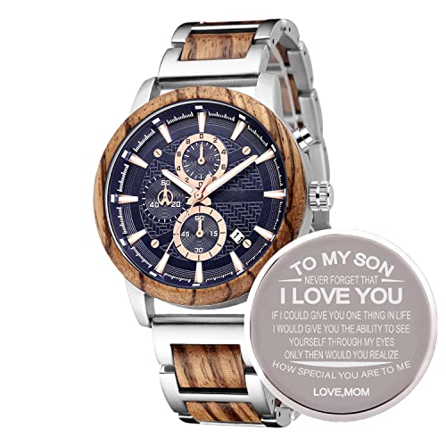 Procurando por um relógio de madeira moderno e elegante para presentear alguém especial? O WASTIME Wooden Watch for Men Women é a opção ideal! Este relógio cronógrafo militar casual com calendário é perfeito para um visual sofisticado e charmoso, tanto para homens quanto para mulheres. Além disso, a cor A- For Son From Mom traz um toque especial e emocionante, tornando-o um presente ideal para mostrar amor e carinho.