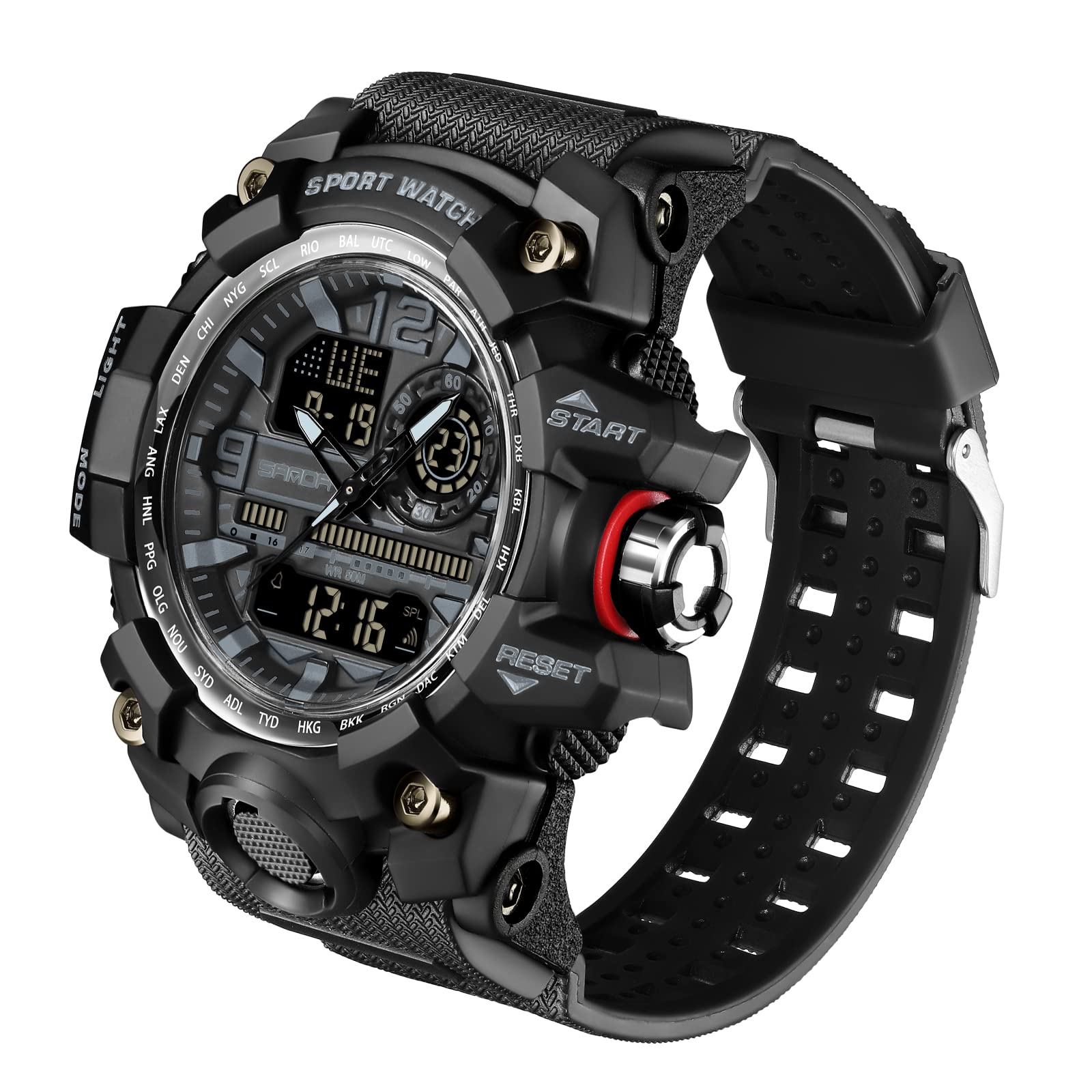 Este é o WISHFAN Men’s Military Watch, um relógio esportivo digital à prova d'água com display duplo e alarme, ideal para homens com pulso grande. Este modelo, na cor black, é o WISHFAN 742. Se você procura um relógio resistente e preparado para enfrentar qualquer ambiente, este é o produto perfeito para você.