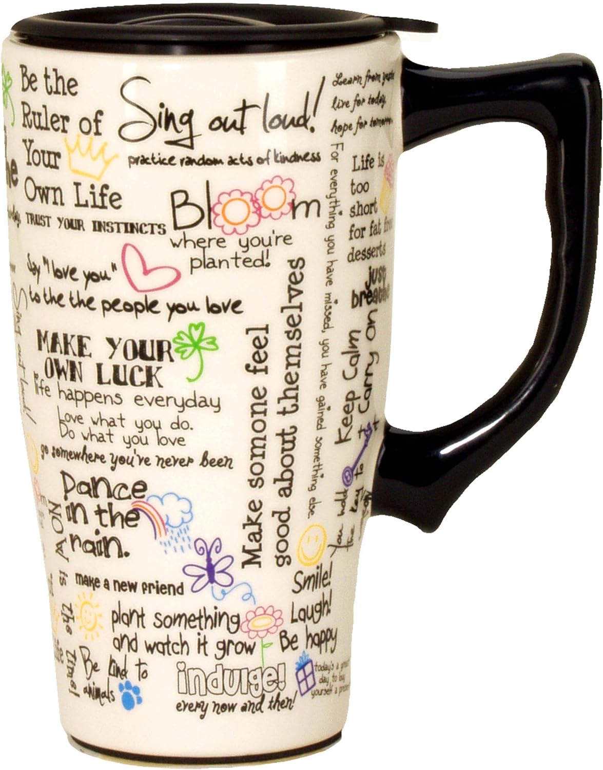 Este lindo copo de viagem da Spoontiques é o produto perfeito para quem está sempre em movimento. Feito de cerâmica, este copo é leve, possui uma tampa de travamento seguro e fundo antiderrapante para evitar vazamentos e derramamentos enquanto você está dirigindo ou correndo atrás das tarefas do dia a dia. Com capacidade para 18 onças de líquido, este copo se encaixa na maioria dos porta-copos de veículos. Além disso, é seguro para ser utilizado no micro-ondas e lava-louças. Disponível em uma variedade de designs coloridos, desde citações motivacionais até personagens favoritos,