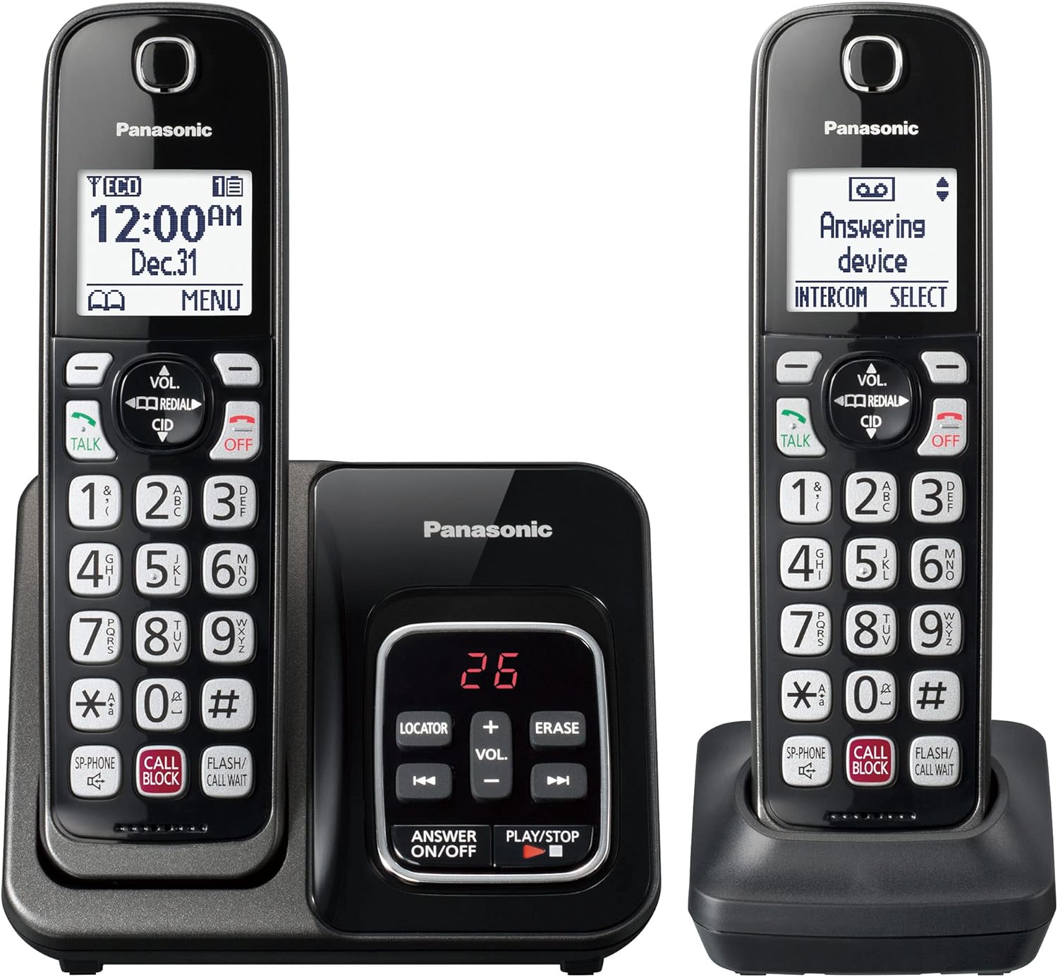 Telefone sem fio Panasonic com máquina de atender, bloqueio de chamadas, identificador de chamadas bilíngue, display de alto contraste, 2 ramais - Preto metálico